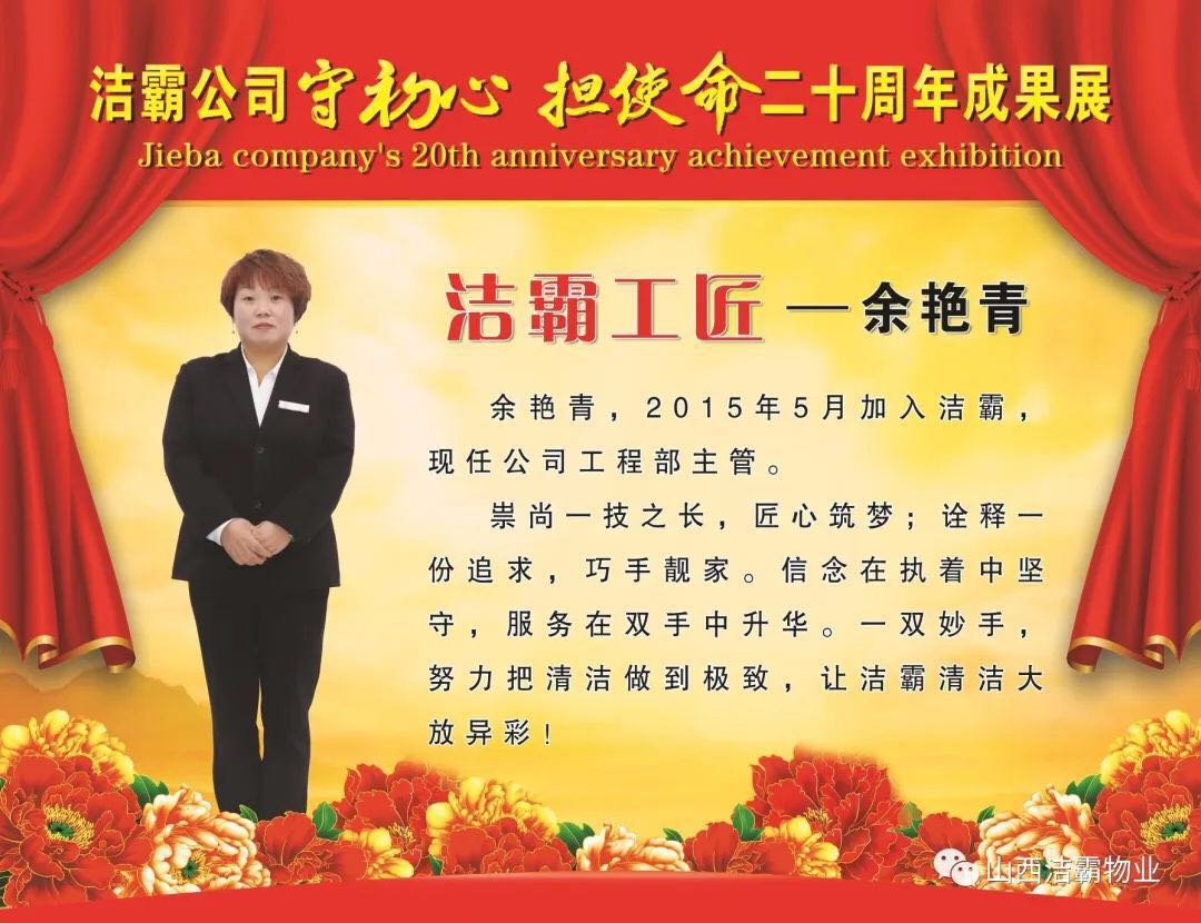 余艷青同志自2015年進(jìn)入潔霸以來,一直奮斗在工程部的第一線從事主管工作。工作中,余艷青同志愛崗敬業(yè),遵守職業(yè)道德,為人誠實(shí)守信;她熱愛工作,對(duì)待客戶熱情周到、耐心細(xì)致;工作中團(tuán)結(jié)同事,責(zé)任心強(qiáng),吃苦耐勞,服從大局,以公司的利益為重。在我市開展的“三洗六見一紅旗”活動(dòng)和全國文明城市的創(chuàng)建活動(dòng)中,她帶領(lǐng)員工高標(biāo)準(zhǔn)、高質(zhì)量、高效率地完成清洗美化工作,為扮靚晉城形象,打造城市優(yōu)美環(huán)境做出了突出貢獻(xiàn)。先后多次被公司評(píng)為優(yōu)秀員工等,2019年在公司成立20周年慶之際,她又被公司授予“潔霸工匠”稱號(hào)。