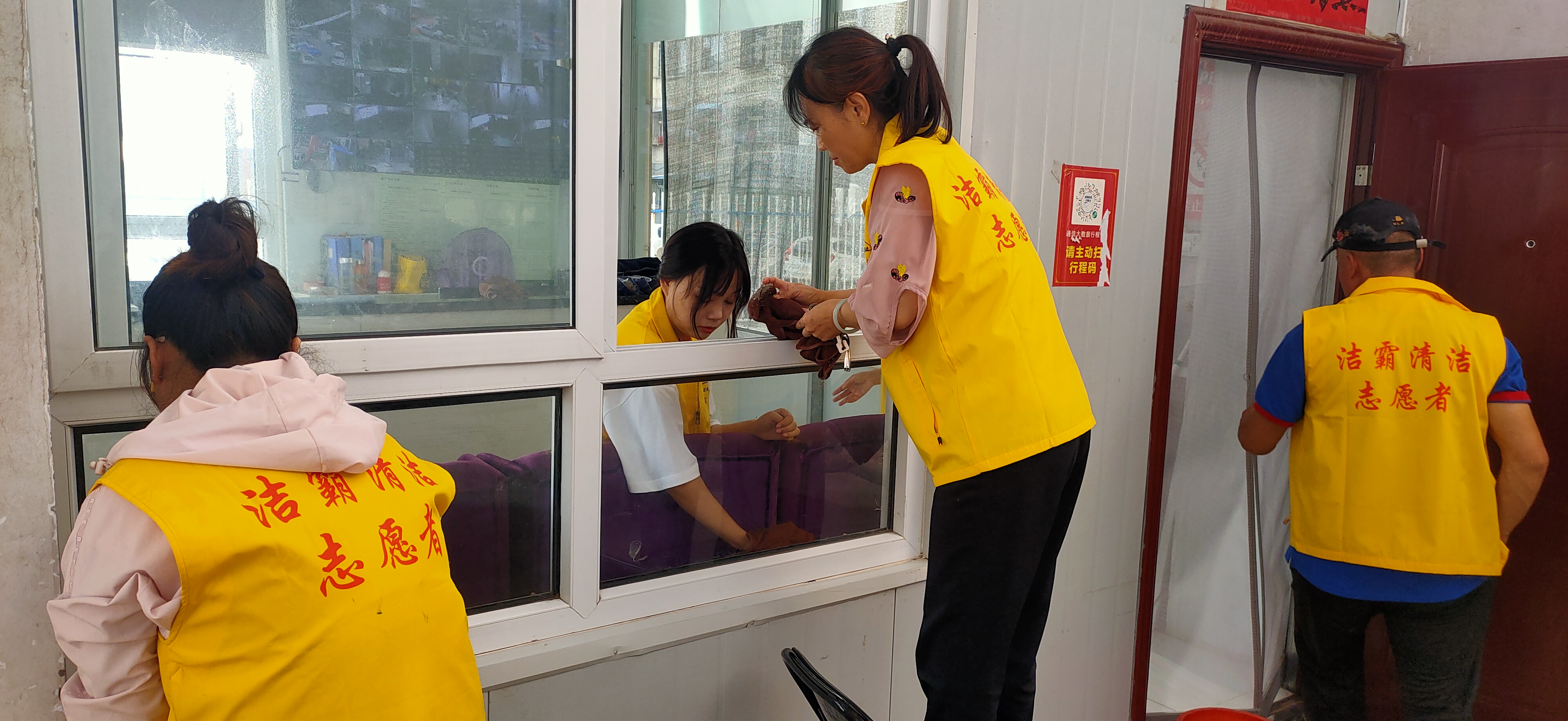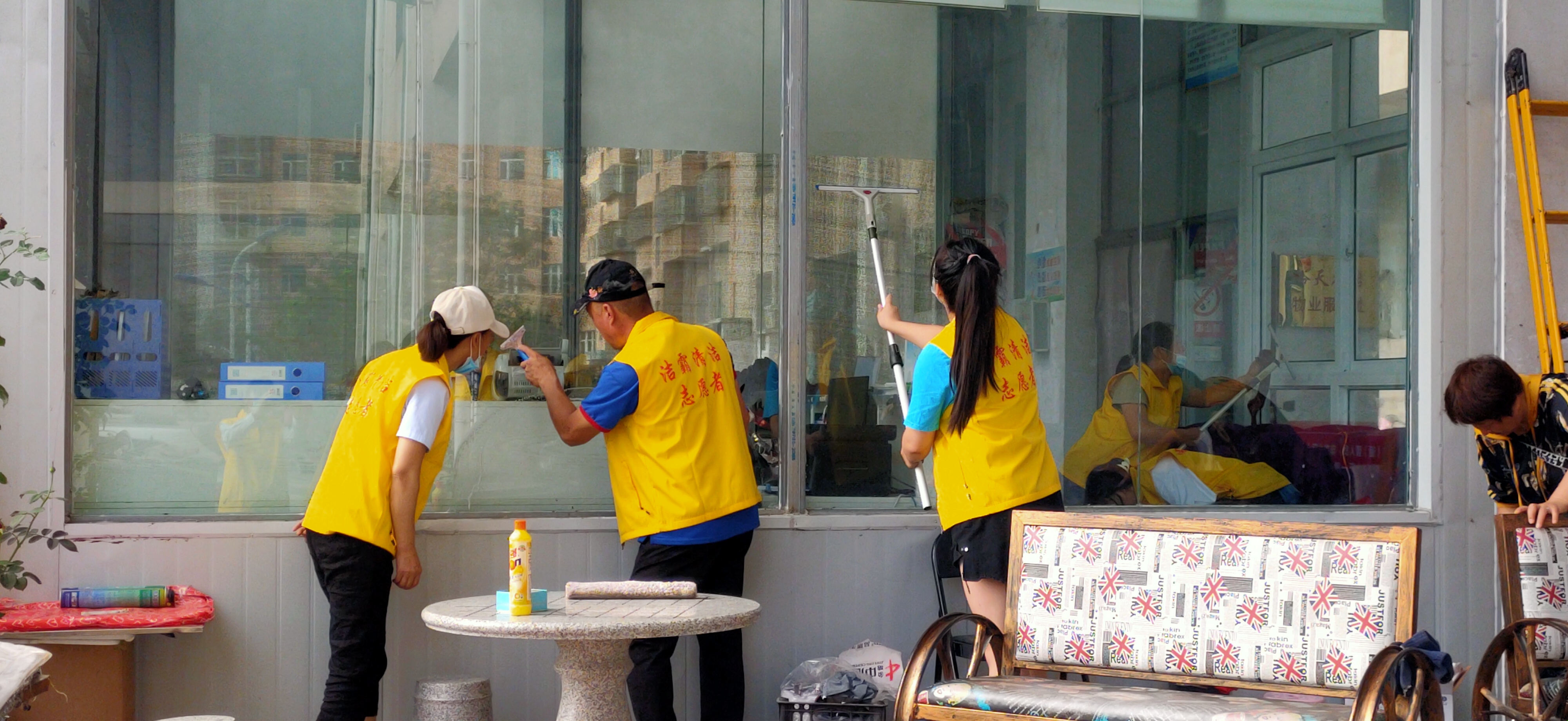 活動現(xiàn)場,志愿者身穿黃色馬甲,自帶玻璃擦、毛巾、笤帚、簸箕等清潔工具,對小區(qū)物業(yè)服務處及小區(qū)環(huán)境進行清潔打掃。他們有的清掃小區(qū)天臺上的垃圾;有的清理樓道門及公共設施上的牛皮癬;有的擦拭門衛(wèi)的玻璃;有的清洗紗窗;有的清洗物業(yè)服務處的玻璃幕墻……志愿者個個干勁十足,不怕臟、不怕累,經(jīng)過一個多小時的團結協(xié)作,小區(qū)環(huán)境煥然一新。