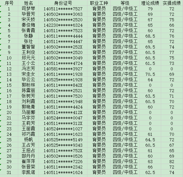 2024年9月27日第10批育嬰員中級(jí)認(rèn)定人員成績(jī)公示
