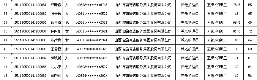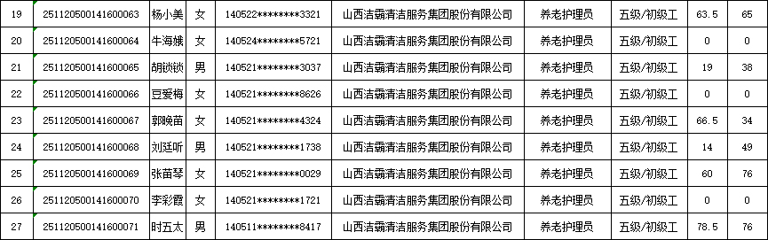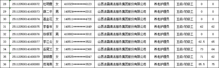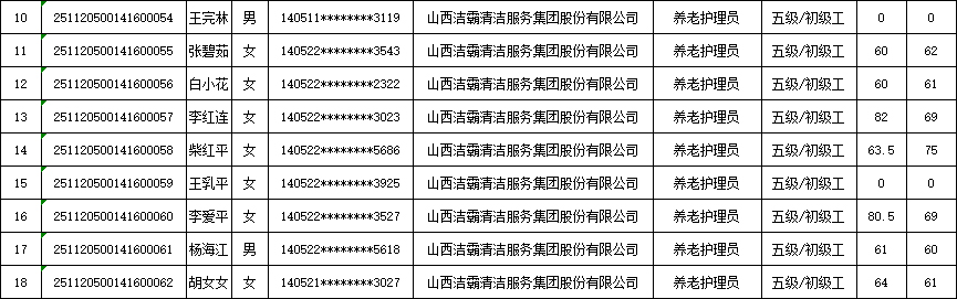 山西潔霸清潔服務(wù)集團(tuán)股份有限公司職業(yè)技能等級(jí)認(rèn)定中心現(xiàn)將2025年11月23日認(rèn)定人員成績公示如下: